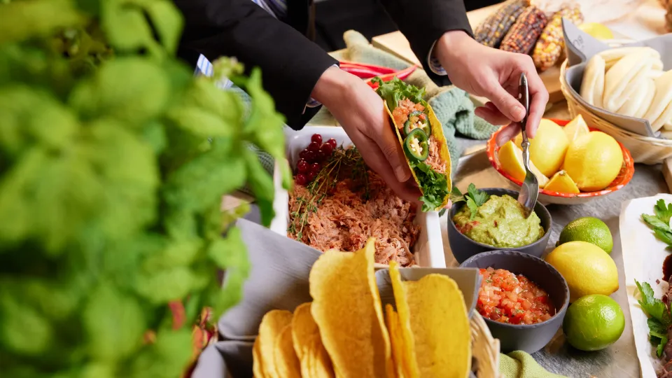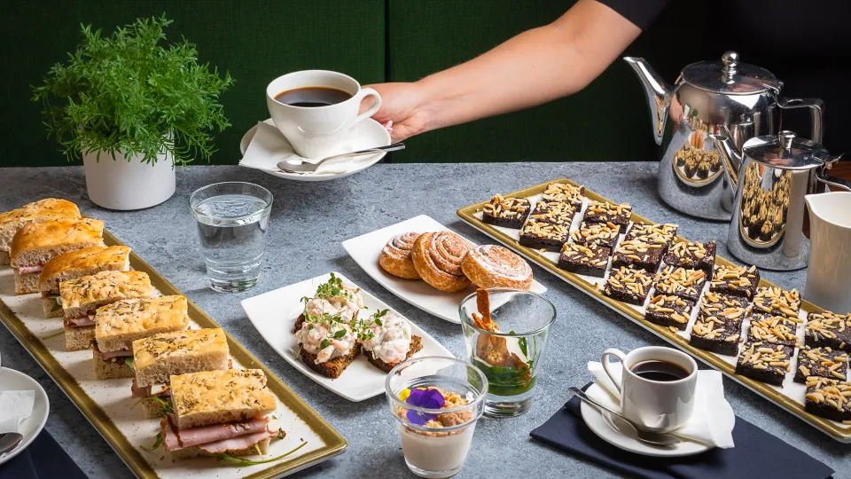В зависимости от мероприятия мы предлагаем участникам всё необходимое для кофейной паузы или сытный закусочный стол. В меню есть салаты, бутерброды, смузи, булочки, фрукты, сладости, а также безалкогольные и алкогольные напитки.