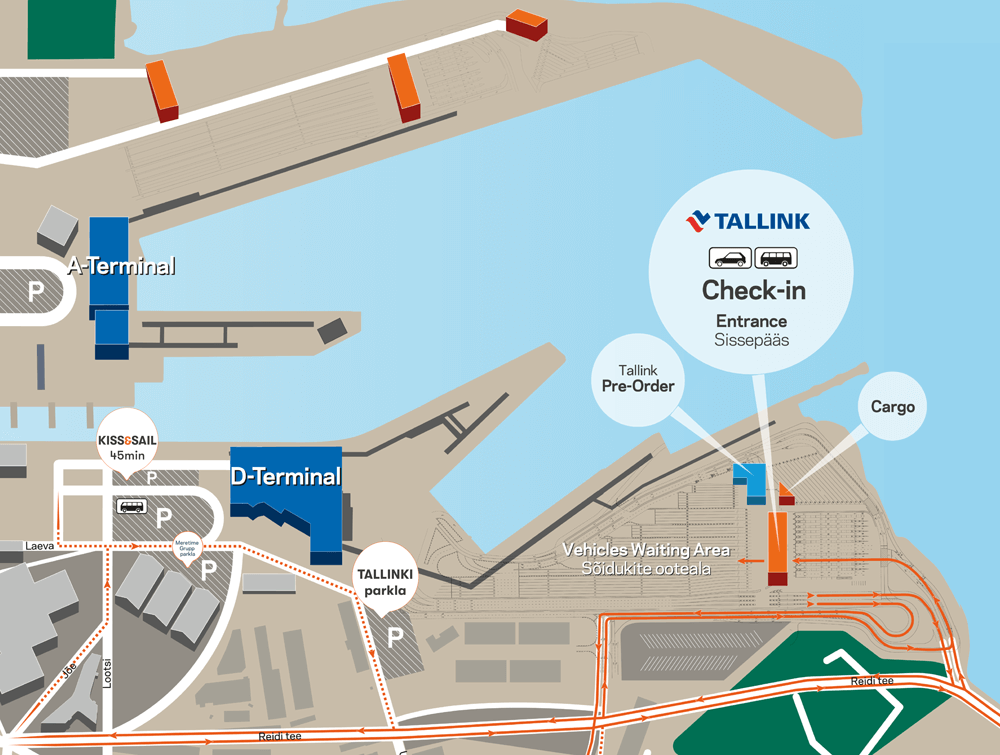 В терминале D зона регистрации (check-in) пассажиров, путешествующих на транспортных средствах, находится по адресу Pikksilma 19/2.